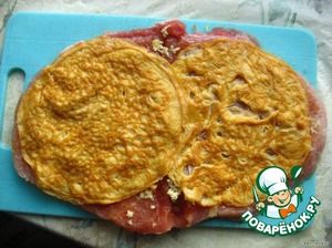 На сухой сковородке жарим яичный блинчик, выкладываем на мясо. У меня была маленькая сковородка, поэтому 2 блинчика сделала.