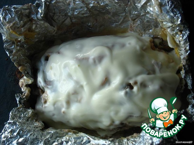 Ставим в разогретую до 230 градусов духовку где-то на часок или около того. Достаем, открываем, смазываем майонезом. И еще минут на 10-15 в духовку, уже в открытом виде, для образования румяной корочки.