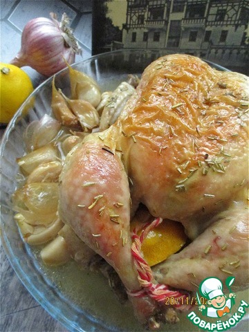 Курица очень вкусна и ароматна: лимон, чеснок, розмарин и вино - ммм! Запекается непременно с 40 зубчиками чеснока )))