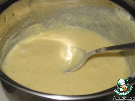 Затем добавить соду. Тут очень важный момент: когда добавите соду, произойдет химическая реакция, тесто вспенится и расслоится. Сверху будут хлопья, а внизу жидкость. Не волнуйтесь, после того, как добавите муку, тесто приобретет нормальный и привычный вид.