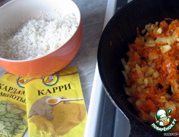 В сковороду к овощам добавить рис. Добавить пряности. Автор предлагает кроме кардамона использовать тмин и кориандр, но я использовала кумин и карри. А, вообще, набор пряностей можете менять в зависимости от предпочтений и настроения.
