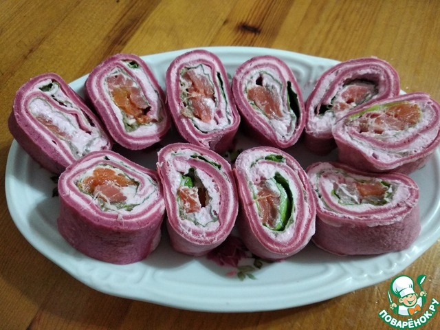 А Вы пробовали свекольные блинчики? Нет... тогда Вам ко мне! Эта закуска из чудесных блинчиков с творожно-орехово-хре новой намазкой, в которой прячется малосольная рыбка в зеленом "покрывале"!