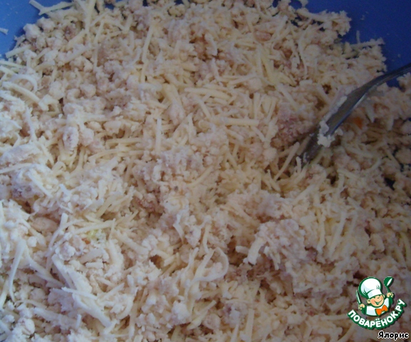 • Смешиваем куриное мясо и тертый сыр, добавляя куриный бульон для сочности