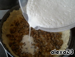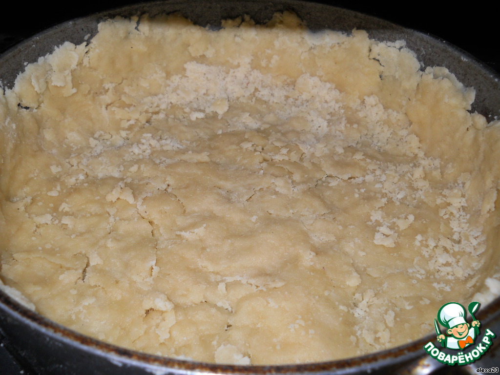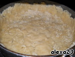 На смазанной растительным маслом форме (23 см) распределить тесто, сделать бортики и выпекать 20 мин. в разогретой до 180 гр. духовке. |