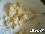 Кубиками нарезать масло, вмешать муку, смешанную с солью и перцем. |