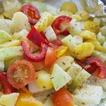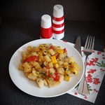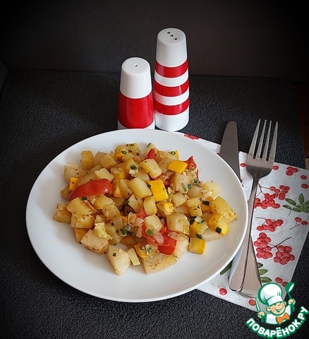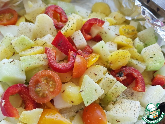 2. Нагреть духовку до 180 гр. В форме для запекания распустить топлeное масло. Репчатый лук очистить, порубить и пассеровать до прозрачности. Добавить картофель, кольраби и помидоры. Перемешать. Веточки пряной зелени вымыть, порвать на кусочки и разложить на овощах. Влить бульон, посолить, поперчить, приправить щепоткой мускатного ореха, кайeнским перцем и сахаром. Жарить в духовке 25 мин. По желанию посыпать зеленью.