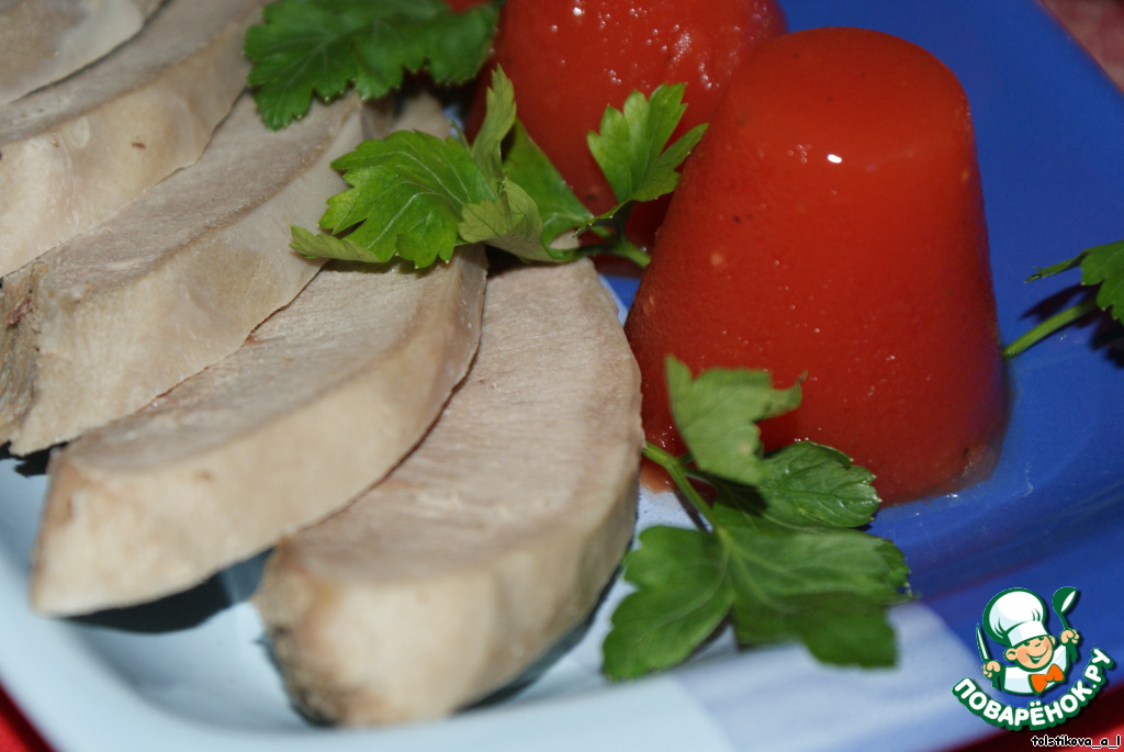 Язык нарезать пластинками, сбрызнуть оливковым маслом, рядом уложить желе и украсить листиками петрушки.