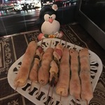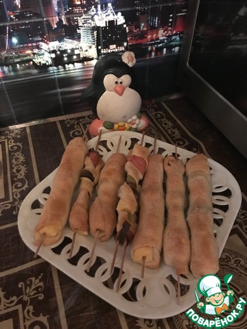 Тесто разморозить, раскатать и нарезать на полоски. Обмотать полосками начинку. Готовые шпажки положить на противень. Сверху посыпать кунжутом и тмином. Поставить в горячую духовку на 15-20 минут.