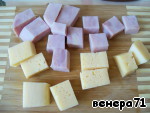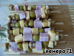 Берем шпажки и одеваем на них - грибы, ветчину, сыр, оливки.