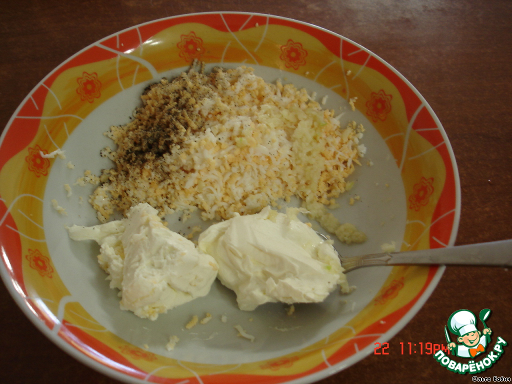 Приготовим начинку: яйца натрем на терке, добавим специи, сыр плавленый, сметану и чеснок, пропущенный через пресс.