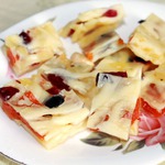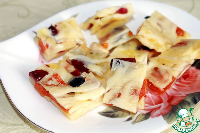 Затем на одну половину нашей сырной заготовки разложить смесь сухофруктов с орехами и слегка их вдавить в сыр.