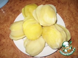 Картошку (лучше брать большую плоскую) почистить, разрезать вдоль на 3 части, средняя самая тонкая, и аккуратно сложить в кастрюлю, все части вместе, как бы целую. Отварить в подсоленной воде до полуготовности (3-5 мин в зависимости от размеров от закипания).