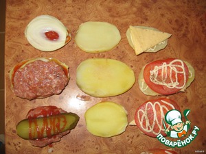 Берем на ладошку первый кусочек, накрываем пустым вторым, сверху переворачиваем начинкой вниз третьим, прокалываем шпажкой для шашлыка или зубочисткой и выкладываем на смазанный раст.маслом противень, сверху смазываем легонько майонезом и посыпаем приправами для картошки. В разогретую духовку 180-200 С на 30-40 мин.