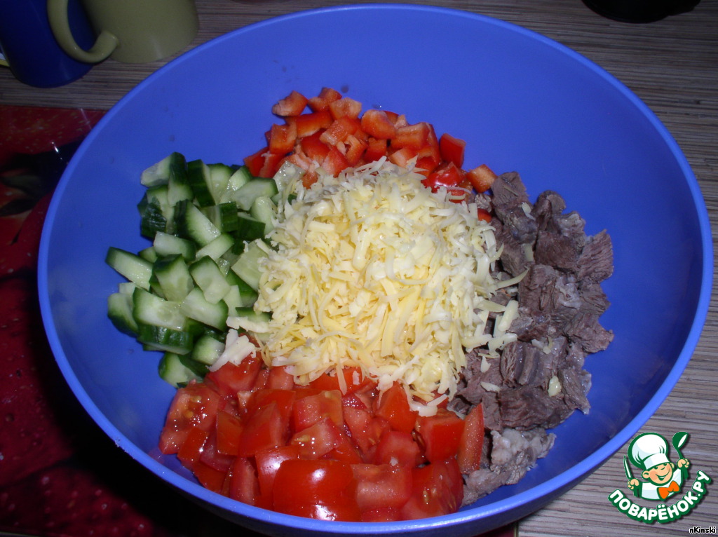 Огурцы, помидоры и перец нарезать кубиками. Сыр натереть на крупной терке. -