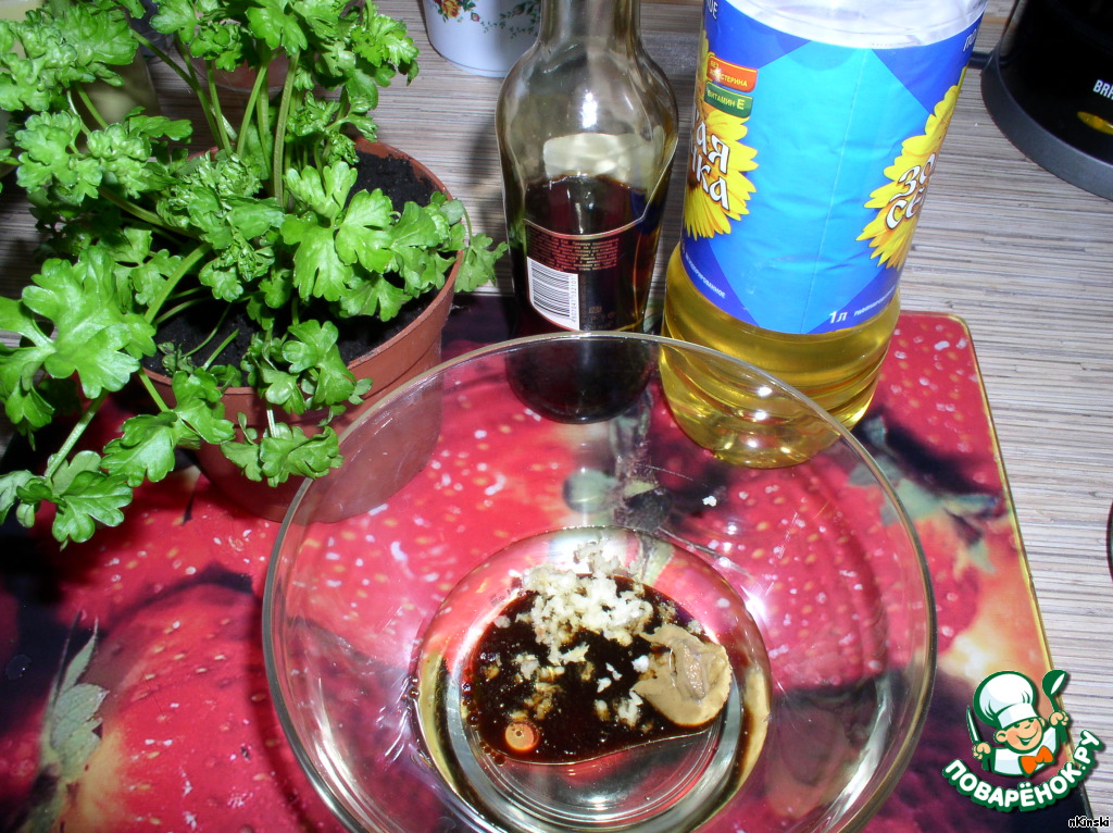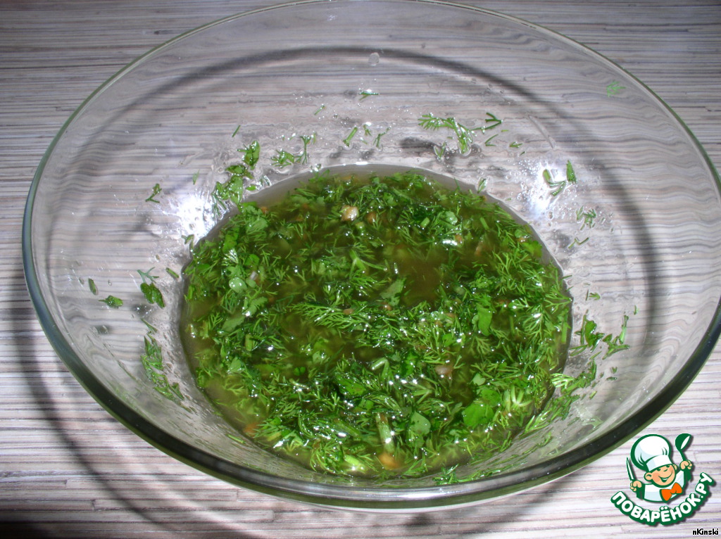 Приготовить соус. Смешать масло, чеснок, горчицу, соевый соус и зелень.