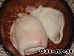 Первым делом варим кальмары. Опускаем в кипяток и варим не более 1 минуты. Во многих источниках написано варить минуты 3, но на себе испробовала, что за этого время кальмар становится жёсткий, поэтому варю кальмары не больше 1 минуты.