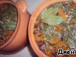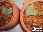 И сверху прикрываем "одеялком" из жареных овощей и пару листочков лаврового листа.