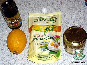 Соединяем майонез, соевый соус, лимонный сок и мед, перемешиваем до однородной массы.
