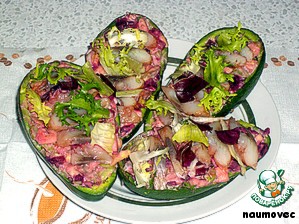 Салат выкладываем в половинки авокадо, то, что осталось, съедаем. Сверху выкладываем ломтики селедки и слегка вдавливаем. Украшаем листиками салата, прикрываем пленкой и даем постоять в холодильнике минут 15 или дольше.
