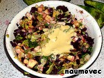 Яблоки чистим и извлекаем сердцевину, режем мелкой соломкой, добавляем. Салат мелко рвем руками или режем полосками, добавляем.