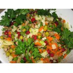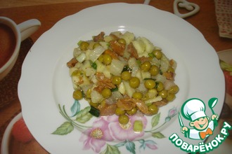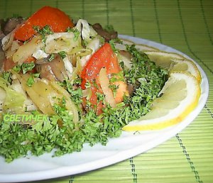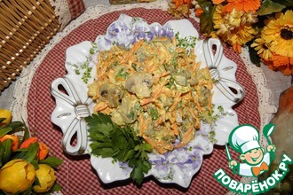 Лeгкий овощной салат с грибами. Рецепт прочитала в местной газете. Приготовила, результат не разочаровал. Надеюсь, и вам, поварята, понравится.