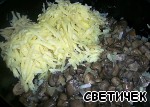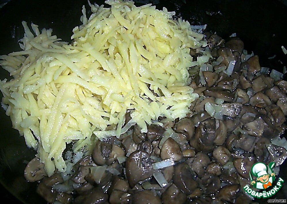 К грибам добавляем натёртый на крупной тёрке картофель и прожариваем до готовности картофеля. Убираем сковороду с плиты.