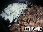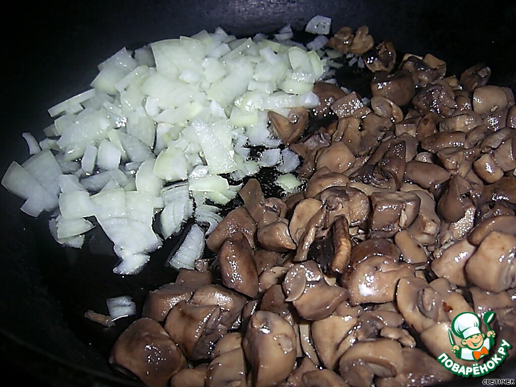 Режем грибы (у меня шампиньоны) на кусочки и обжариваем на сухой сковороде до испарения влаги. Добавляем оливковое масло + порезанный на кусочки лук. И прожариваем вместе с грибами до прозрачности лука.