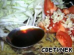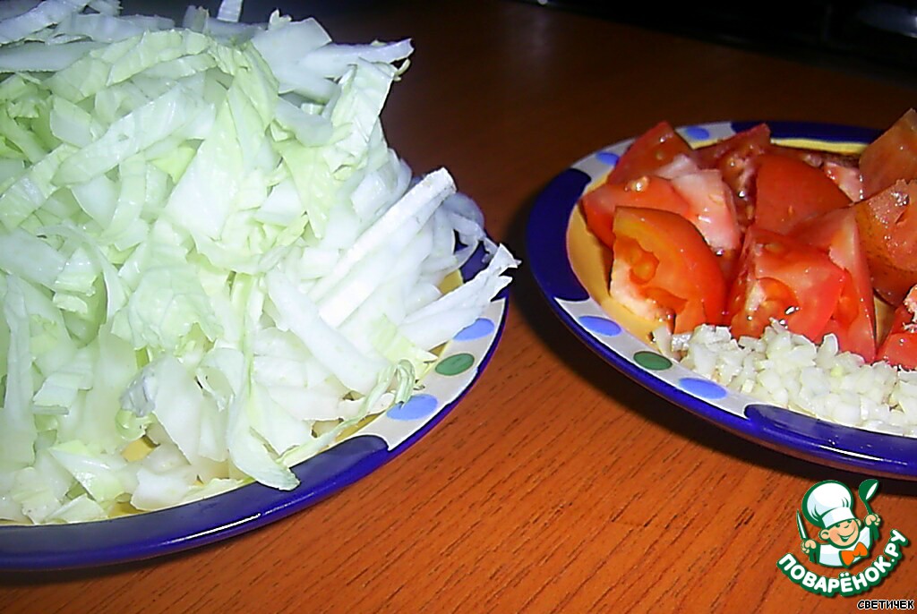 Шинкуем пекинскую капусту, режем кусочками помидоры, чеснок рубим ножом.