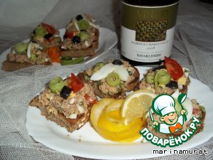 ...положить начинку, сверху украсить (тоже по желанию и вкусу). У меня - черри, немного вареного яйца, пару полосочек огурца и оливки!!!!