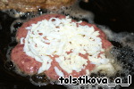 А дальше все как обычно: разогреваем масло, выкладываем ложкой печеночную массу, на нее припек. Жарить 3 минуты с одной стороны, перевернуть, и с другой стороны 3 минуты.