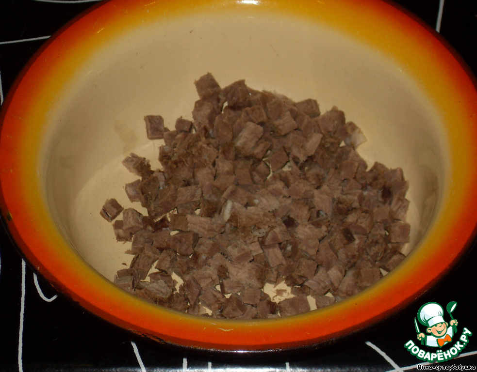 Нарезать мясо маленькими кубиками. -