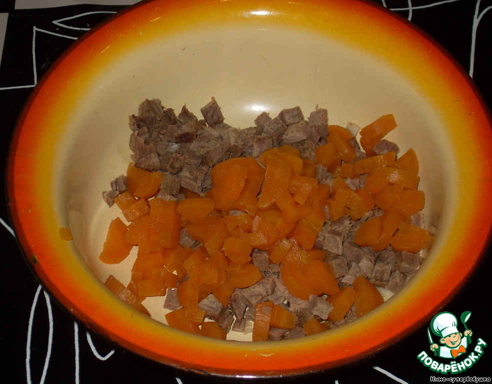 Говядину и морковь отварить и остудить. Мясо остужать в бульоне, чтобы оно не заветрилось.