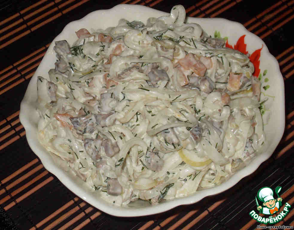 Сделала мужу к 23 февраля. Очень мужественный, очень мужской салатик. Для больших любителей лука. Отличная закуска к водке.