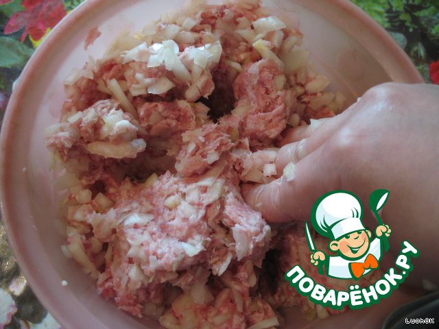 • Смешать фарш с луком. Хорошо перемешать. Посолить, поперчить и подлить немного водички, чтобы фарш был мягким.