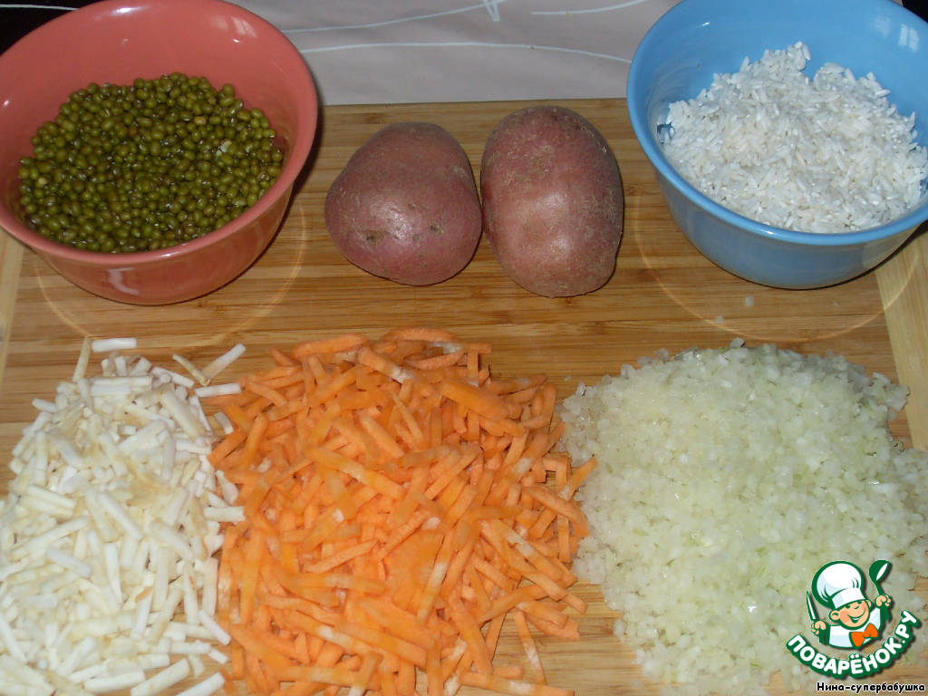 Пока варится маш, подготовить другие продукты. Лук, морковь и сельдерей очистить. Лук измельчить, морковь и сельдерей нарезать соломкой. Промыть рис.