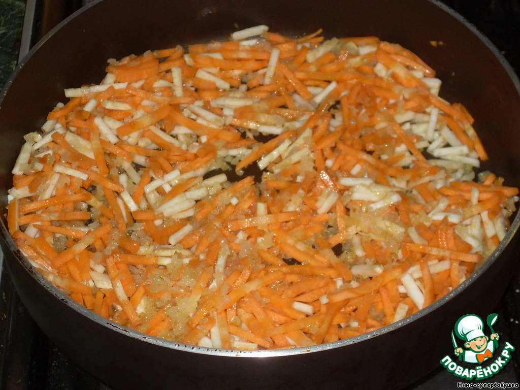 В сковороде растопить ложку топленого масла или разогреть пару ложек растительного. Обжарить лук до золотистого цвета.