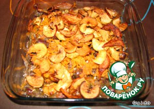 Теперь самое важное - сухофрукты. Если они у Вас пересушены, рекомендую на паровой баньке их привести в состояние помягче. Кладем сверху.
