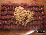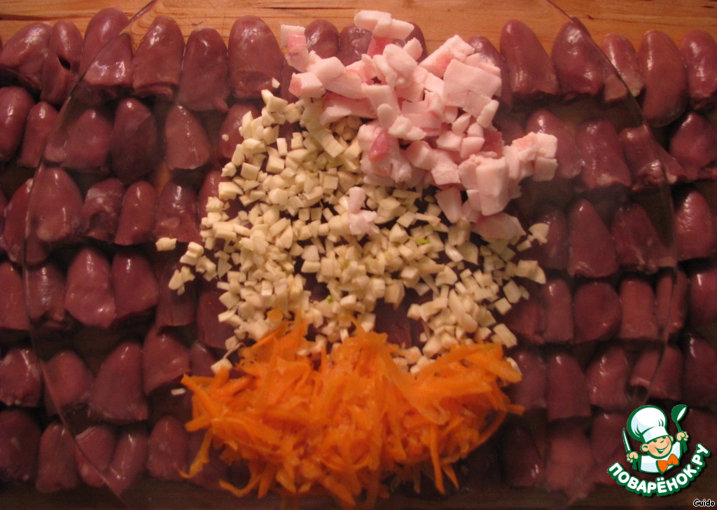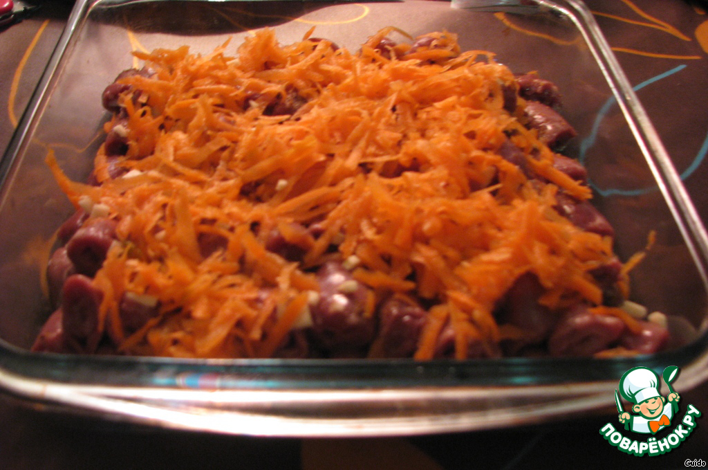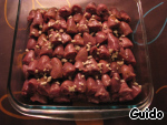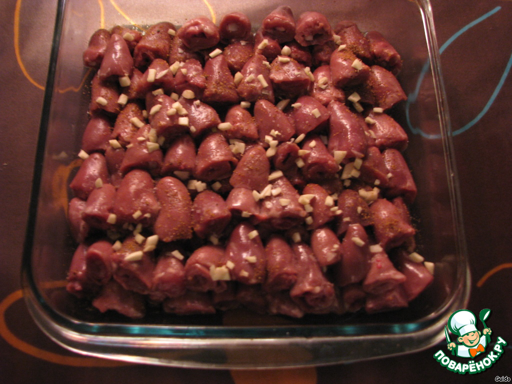 Дно жаропрочной посудины (простите, я не знаю как эта штука называется) слегка смазываем подсолнечным маслом. Выкладываем туда сердечки. По ходу процесса: солим и добавляем специи, чеснок и сало. Соль и специи я сыпал "на глаз". Но, специй должно быть много: смесь перцев прекрасно подойдет. Остальное - по вкусу.