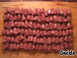 Куриные сердечки чистим от жира и пленки, срезаем краешки.