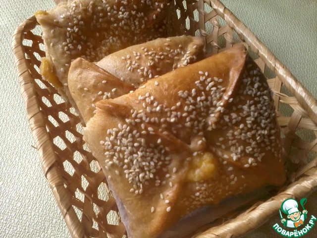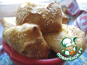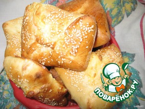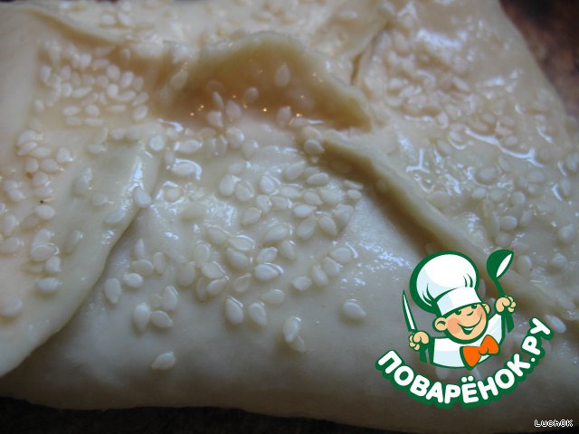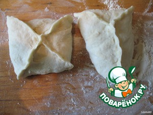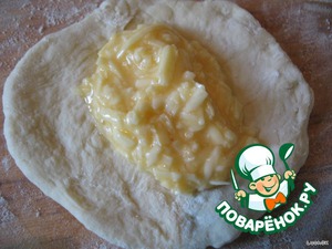 Отрезаем по кусочку и придаем ему форму лепёшечки. На неё кладём сырную начинку