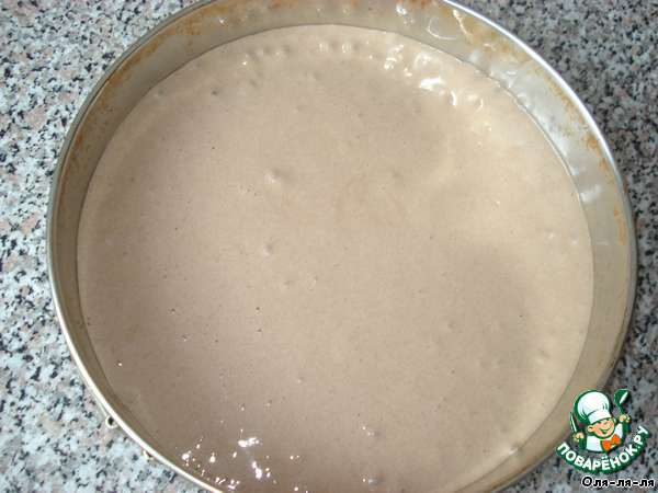 Для бисквита взбиваем белки, добавляем 200 гр сахара, желтки, ещё раз взбиваем. Соединяем с мукой, разрыхлителем и какао и тщательно перемешиваем. Форму для бисквита смазываем растительным маслом и прогреваем в духовке, выливаем тесто. Выпекаем 20 – 30 мин.
