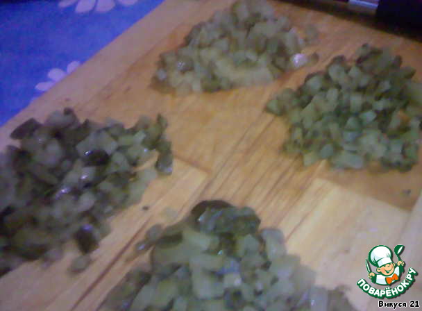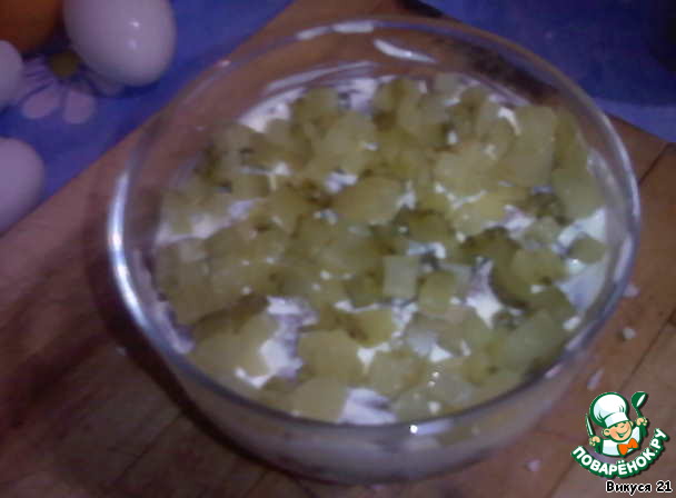 Режем маринованые огурчики и вареные яйца, сначала выкладываем 3 слоем огурчики, а 4 слоем яйца, и промазываем майонезом.