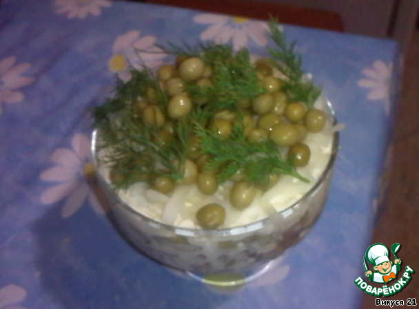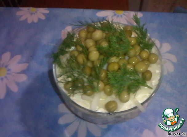 Натрем сыр на крупной терке, выкладываем 5 слоем, поверх выкладываем горошек, и украшаем зеленью. Можно кушать сразу, а можно поставить в холодильник на часик для пропитки.