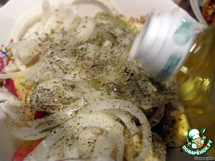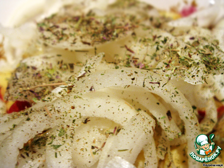 Фрукты и лук щедро посыпаем специями и травами. |