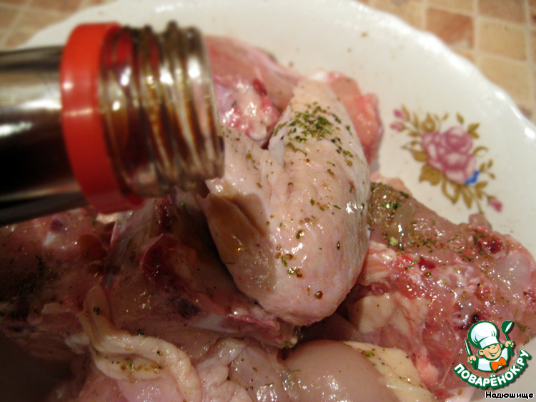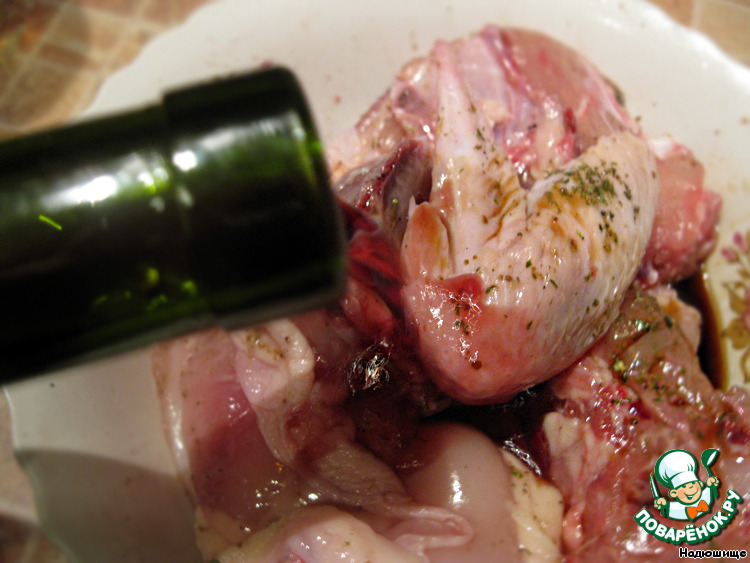 Куриное мясо тоже приправляем специями, добавляем вино. |
