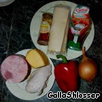 Тесто я купила дрожжевое слоеное, но лучше взять бездрожжевое (так быстрее). Еще нужны: ветчина, вареная грудка, сырок, перец болгарский, лук, кетчуп, растительное масло (для смазки противня и сверху). Еще, если любите поострее, нужны острые перчики. Я взяла перец пири-пири.