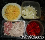 Сыр натереть, перчик порезать маленькими квадратиками, лук - полукольцами, ветчину и грудку мелко накрошить.