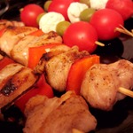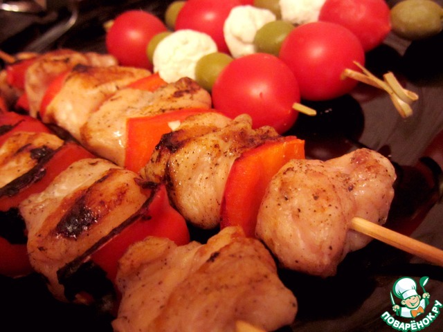 Обжариваем шашлычки на сковороде с маслом. Делаем "салат" на шпажках. для этого нанизываем моцареллу, оливки и помидорчики черри.