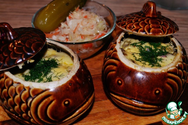 Перед началом трапезы я хорошо перемешиваю содержимое горшочков и даю немного остыть, чтобы не обжечься. А за время остывания я нарезаю маринованные и солёные огурчики, которые отлично подходят к этому блюду!!!