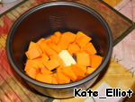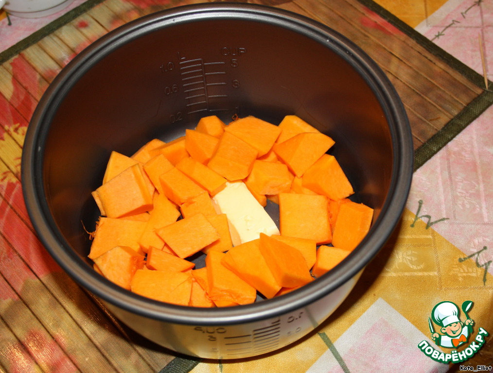 Сначала положить в мультиварку нарезанную тыкву и 25 грамм масла.